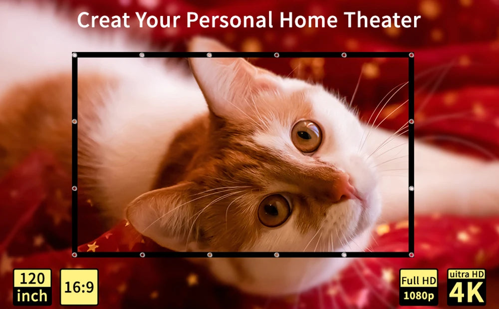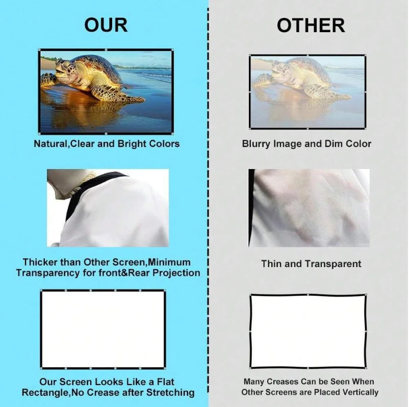 *This projector screen used soft touch and stretchy thick fiber to ensure wrinkle free after folded or compressed, providing clearer images, brighter colors and no color cast.