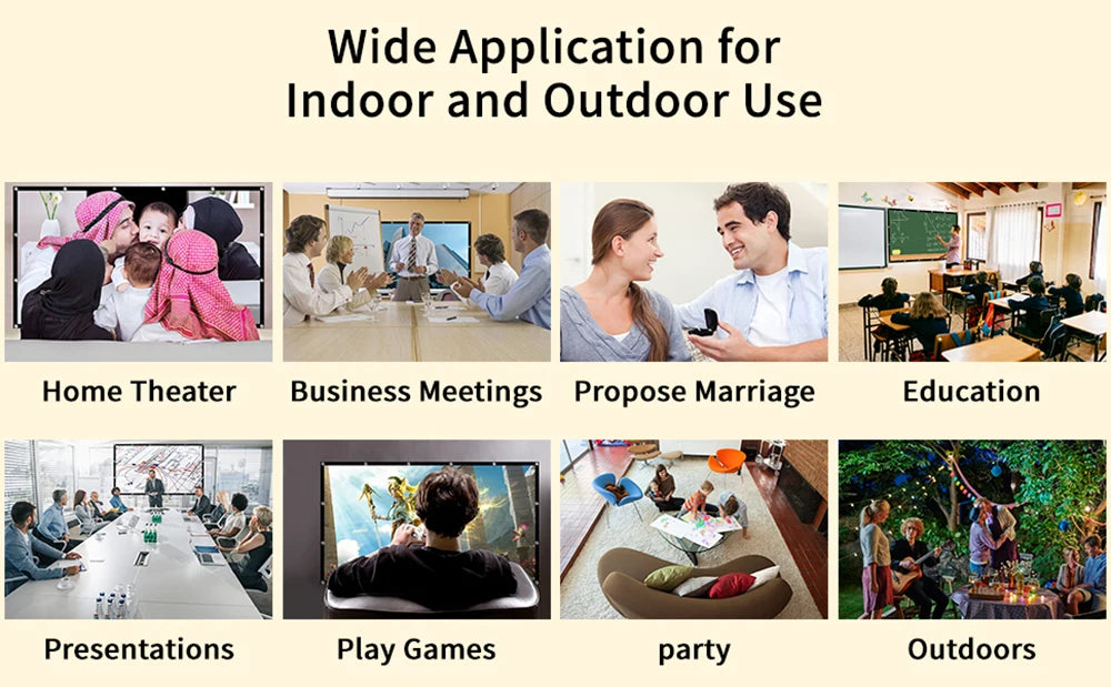 *Wide Application - The 3d projector screen with good pictures quality and lightweight design is not only suitable for indoor, such as home theater, education, presentation, lectures, offices, classroom or gaming etc, but also for outdoor use.